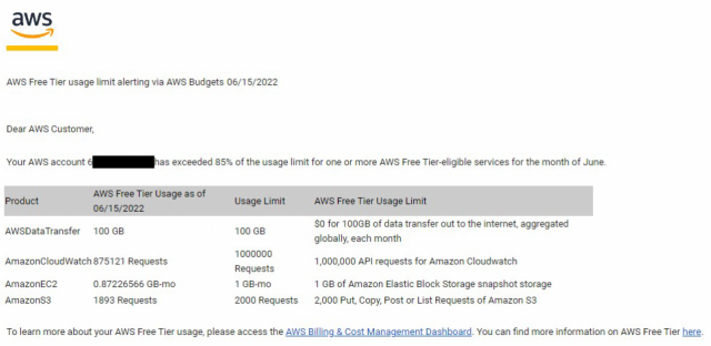 AWS Free Tier Usage Alerts leverage AWS Budgets to send alerts. AWS Budgets automatically notifies you via email when you exceed 85% of your Free Tier limit for each service. For additional tracking, you can set up AWS Budgets to track your usage to 100%of the Free Tier limit for each service. By default, AWS sends an email to the email address you used to create your account.