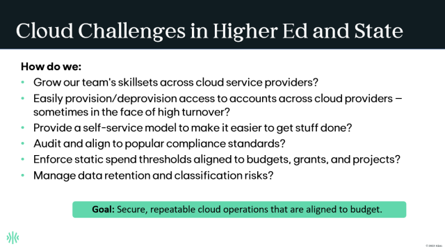 We just wrapped a webinar with Andrew Marcontell, Executive Director of Solutions Engineering at Texas A&M, and our VP of Product, Shane Quinlan, where we covered the cloud operations challenges in higher education and state government. Shane and Andrew discussed how to overcome challenges in the cloud to build solutions that serve citizens and students cost-effectively and securely – while delivering value to their cloud project teams.
